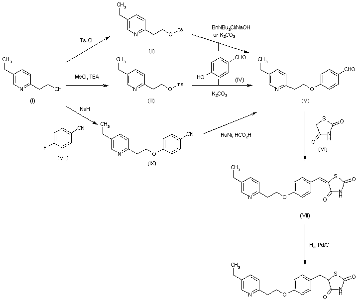 A new short synthesis of troglitazone has been described: Condensation of the bromoacetal (I) with 4-hydroxybenzaldehyde (II) by means of K2CO3 and NaI in refluxing acetone gives the unsaturated ether (III), which is cyclized with trimethylhydroquinone (IV) by means of bis(trifluoromethylsulfonyl)imide in dichloromethane to yield the 6-hydroxybenzopyran (V). Acylation of (V) with acetic anhydride and DMAP in THF affords the expected acetoxybenzopyran (VI), which is condensed with thiazolidine-2,4-dione (VII) by means of piperidine in toluene to provide the 6-benzylidene-thiazolidine (VIII). The hydrogenation of (VIII) with H2 over Pd/C in methanol gives the corresponding benzyl derivative (IX), which is finally deacetylated with AcOH/HCl/water (3:1:1) in MeOH.