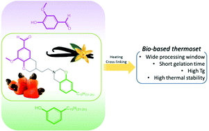 With the ongoing efforts to promote the development of bio-based dibenzoxazine thermosets, we explore herein a new strategy aiming at the synthesis of asymmetric dibenzoxazine monomers from naturally occurring phenolic compounds, cardanol and vanillin. By taking advantage of the low reactivity of cardanol, a monosubstituted cardanol-based benzoxazine monomer was prepared and further coupled with vanillin to yield vanillin–cardanol di-benzoxazines. The structural features of the resulting products were substantiated by 1H NMR and HR-MS. The occurrence of the thermally-induced ring-opening polymerization was monitored by rheological measurements and DSC. At 190 °C the new asymmetric monomers showed a moderate gelation time (8 min) compared to 30–31 min revealed for cardanol-based (di-card) dibenzoxazines. Once polymerized, they exhibited a high Tg (129 °C), while the di-card flew under heating because of its low cross-linking density. Asymmetric monomers also exhibited lower melting temperatures than their symmetrical congeners based on vanillin, which significantly enlarge the processing window between the melting and polymerization temperatures up to 126 °C instead of 7 °C for symmetric vanillin-based dibenzoxazines. Therefore, such a strategy constitutes an efficient and versatile route for an easy elaboration of biobased monocomponent thermosets and can be applied to a wide range of phenolic compounds derived from renewable resources.