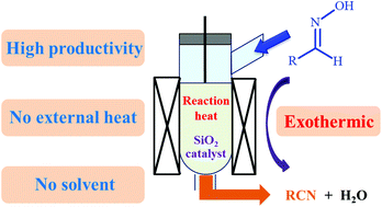 A vapor-phase dehydration of acetaldoxime to acetonitrile was investigated over various solid catalysts. Among the tested catalysts, ZrO2, Al2O3 and SiO2 showed high catalytic activity for the formation of acetonitrile from acetaldoxime, while the correlation between catalytic activity and the acid property of the catalysts was not observed. Weak acidic sites such as silanols sufficiently work as catalytic sites for the dehydration, which does not require strong acids such as zeolites. Several SiO2 catalysts with different physical properties were tested, and the SiO2with the smallest pore size and the highest specific surface area showed the highest catalytic activity for the formation of acetonitrile. Because the dehydration of acetaldoxime to acetonitrile is exothermic, a large amount of reaction heat was generated during the reaction, and the reaction temperature was found to be significantly affected by the feed rate of the reactant and the flow rate of the carrier gas. In order to effectively utilize the in situ generated reaction heat, the dehydration of acetaldoxime to acetonitrile without using the external heat supply was conducted. The temperature was controllable even in the absence of the external heat, and the acetonitrile yield higher than 90% could be achieved in such a green operation under the environment-friendly adiabatic conditions.