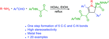 An efficient synthesis of fully substituted 2,3-dihydropyrroles has been achieved in one step through the three-component reaction of amines, aromatic aldehydes and α-ketoamides. This atom-economical and catalyst-free reaction is highly stereoselective and generates underexplored heterocycles in a single step. These compounds were examined in an enzymatic assay that led to the identification of potent α-glucosidase inhibitors, thereby demonstrating the utility of this novel methodology in medicinal chemistry.